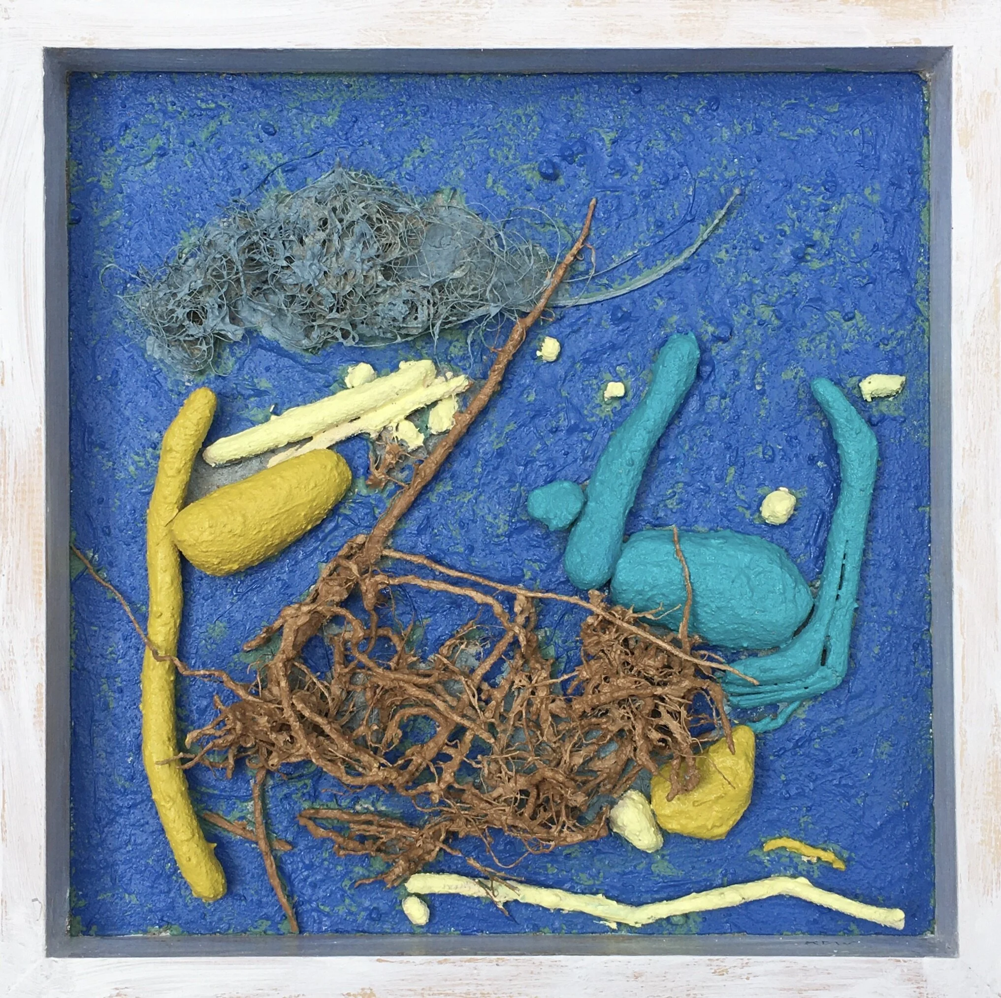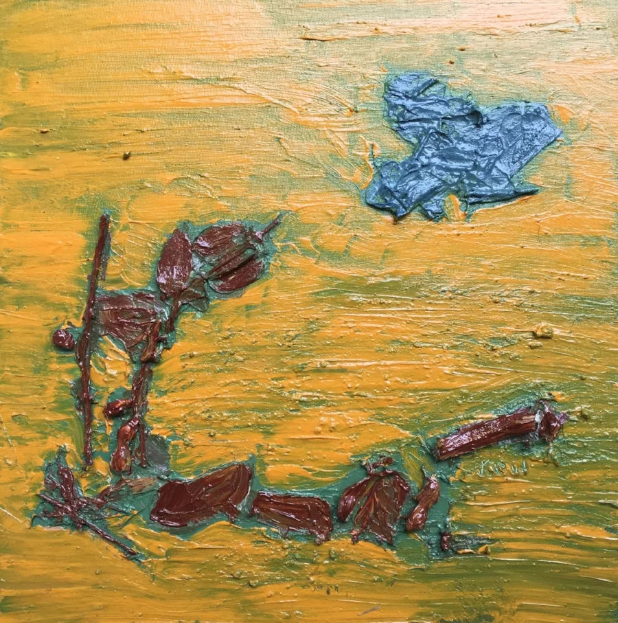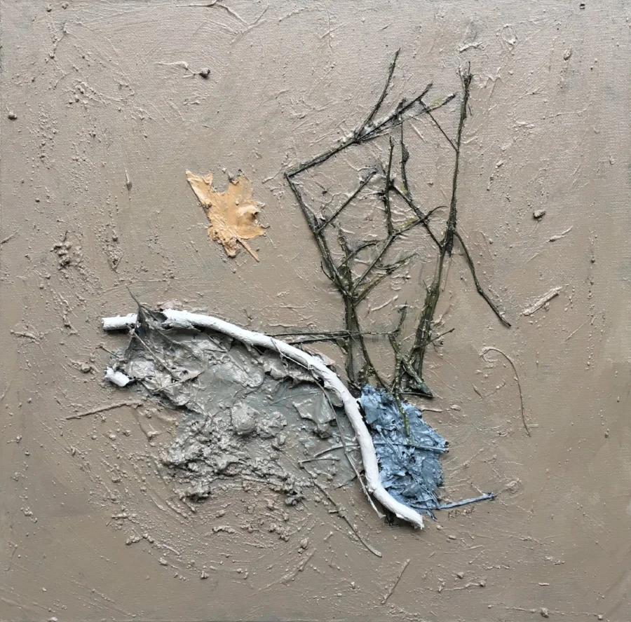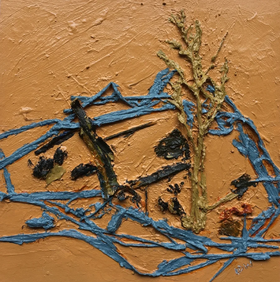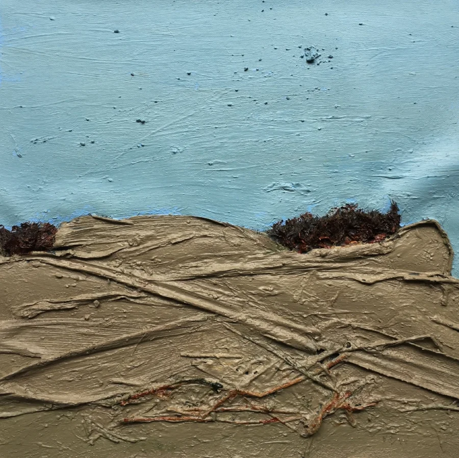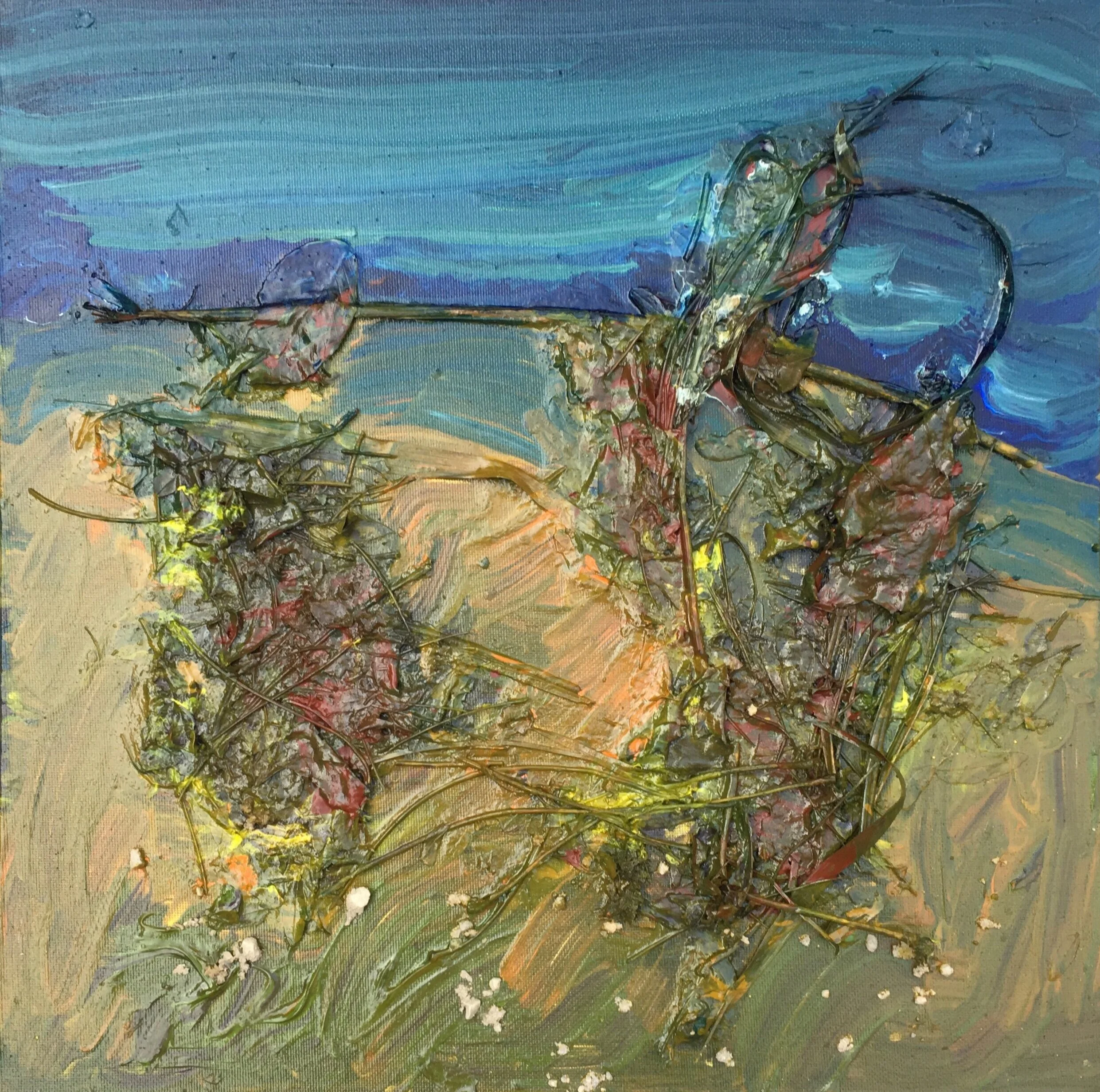 These artworks were apart of the “Land and See” exhibit for the 2021 Garage Gallery Benmiller Season. Of the 6 panel boxes below, the first one was painted outside the fenced area of the beach while it was being repaired from the winter thaw. But as it turned out, those same fences were then used to keep people from entering the beach because of the covid restrictions. The remainder of the 5 panel boxes below were completed intuitively in the studio with the materials from the above raked debris and detritus on the beach road near Cove Beach, Goderich ON.