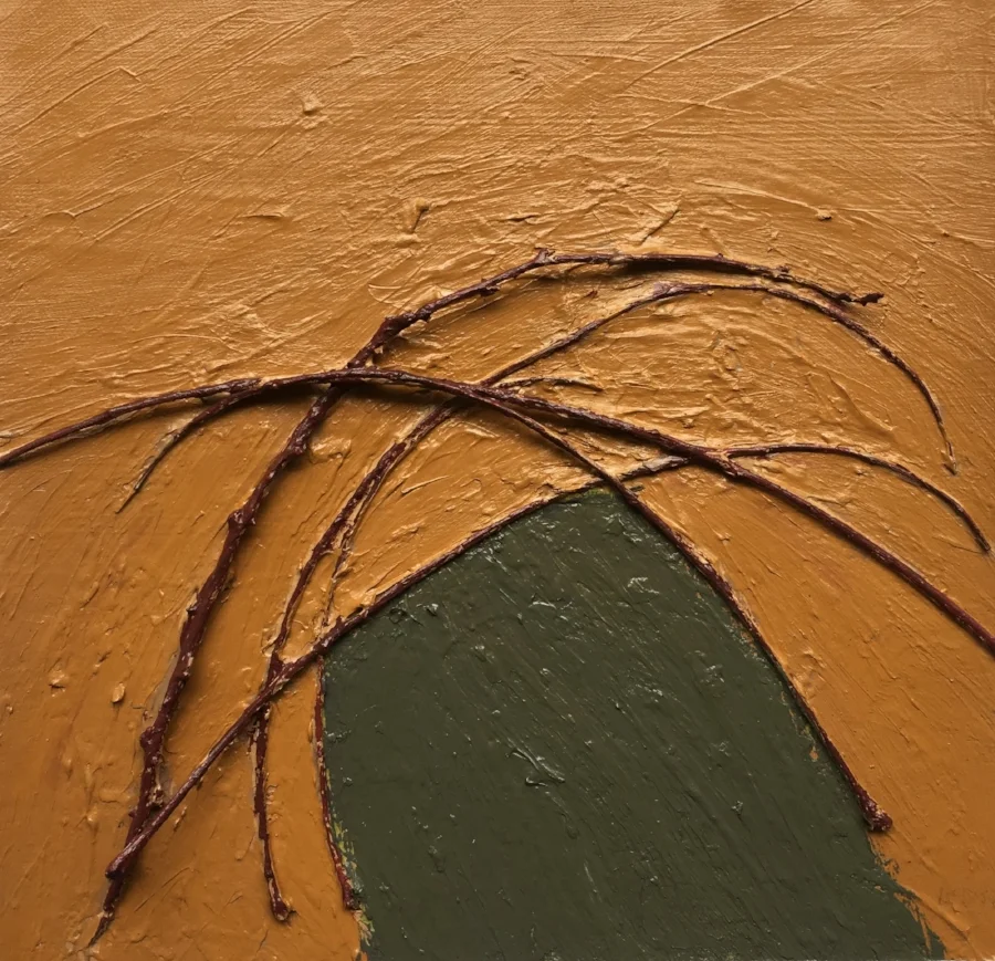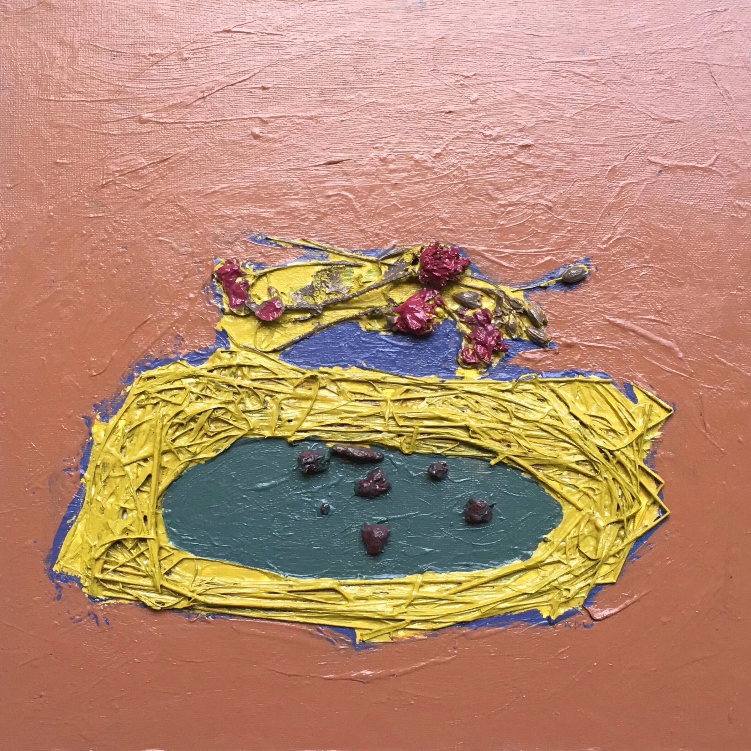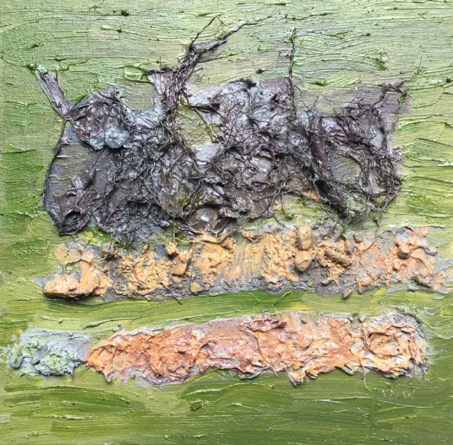 The paintings just below this paragraph are from a workshop and a sojourn in Tuscany, Italy, June 2017 offered by 'Walk the Arts'. I did not have my usual materials with me, such as string and threads, but I did have the materials from the landscape itself (material mementos) and its impressions on me. Because the materials are new, the artwork took on a different kind of style and a new type of expression for me. My thought process is a kind of taking all the surrounding images in and intuitively lay the land-fibres into a position that describes where I am in the landscape, the colours in situ, and the feelings that are invoked from it all. I have no idea how the painting will turn out when I sit down to paint.