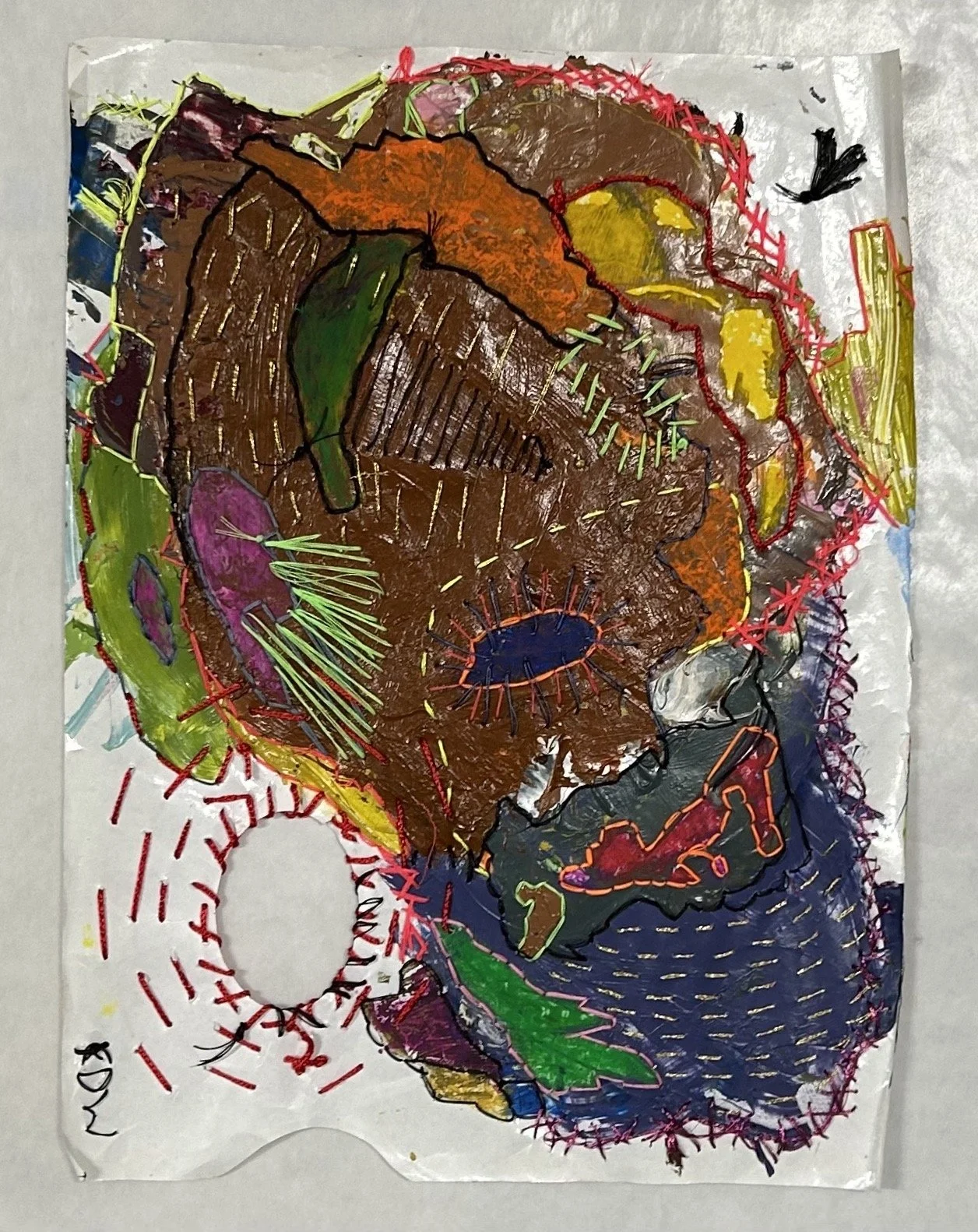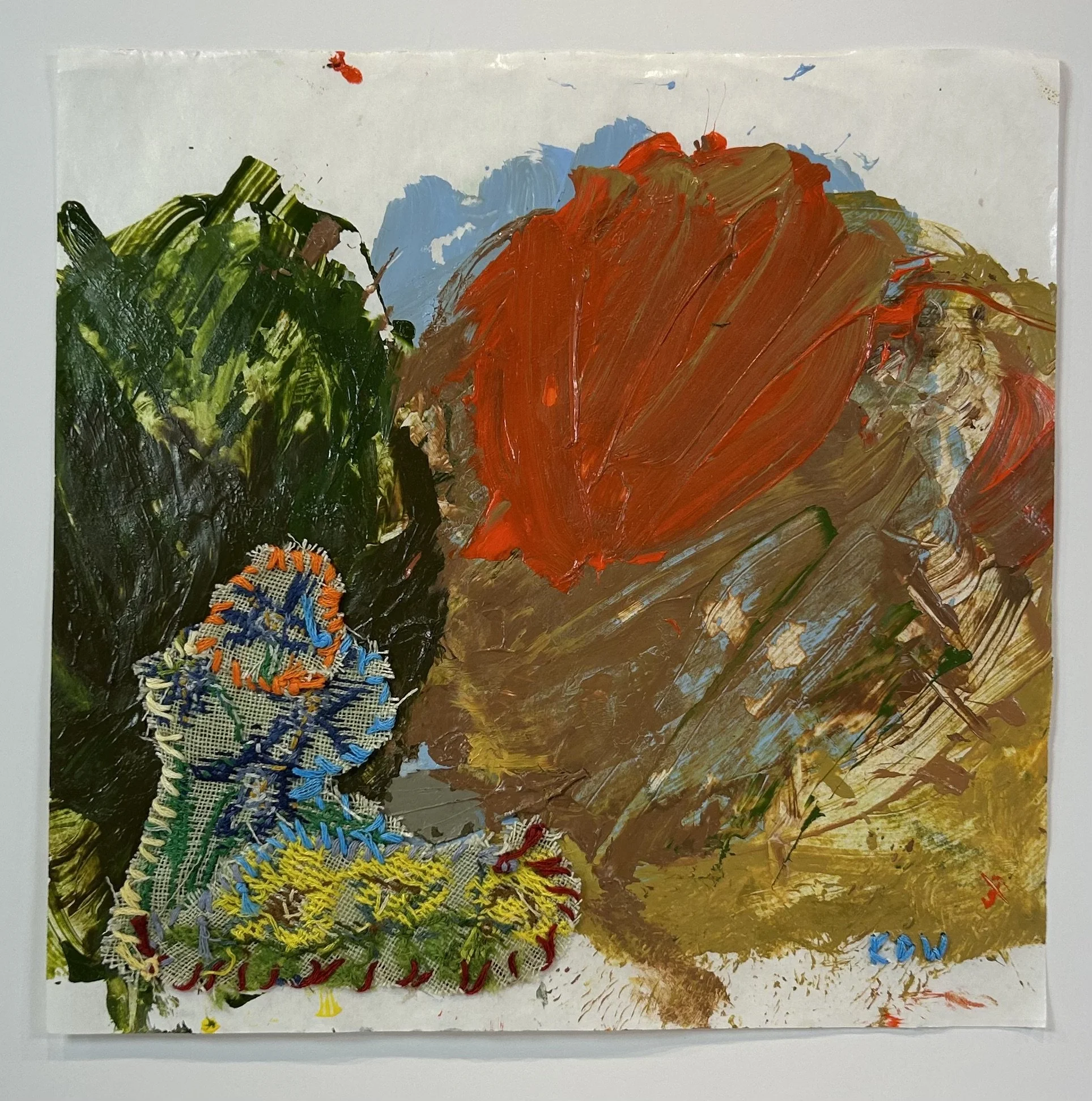 The following pieces are made from the paper palettes that I mixed the paint on before applying to the βen plein airβ artworks above. I have used stitching as a way to express myself on these saved paint filled palettes. For most of the palettes I have collaged embroidered linen with the back side of a embroidered flowers being exhibited onto the palette.