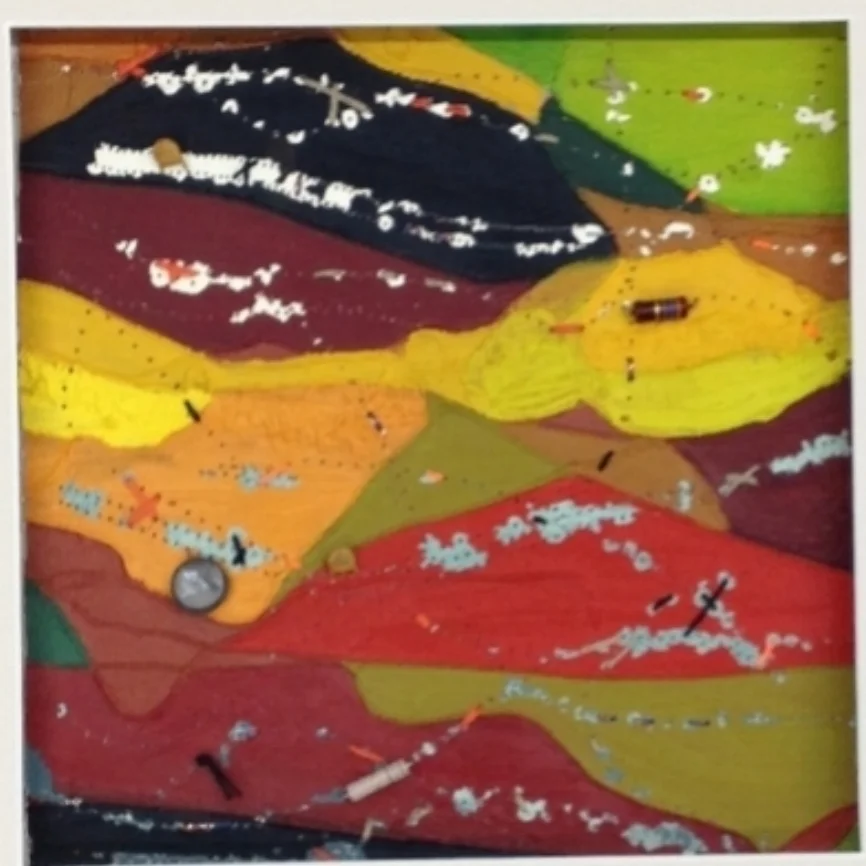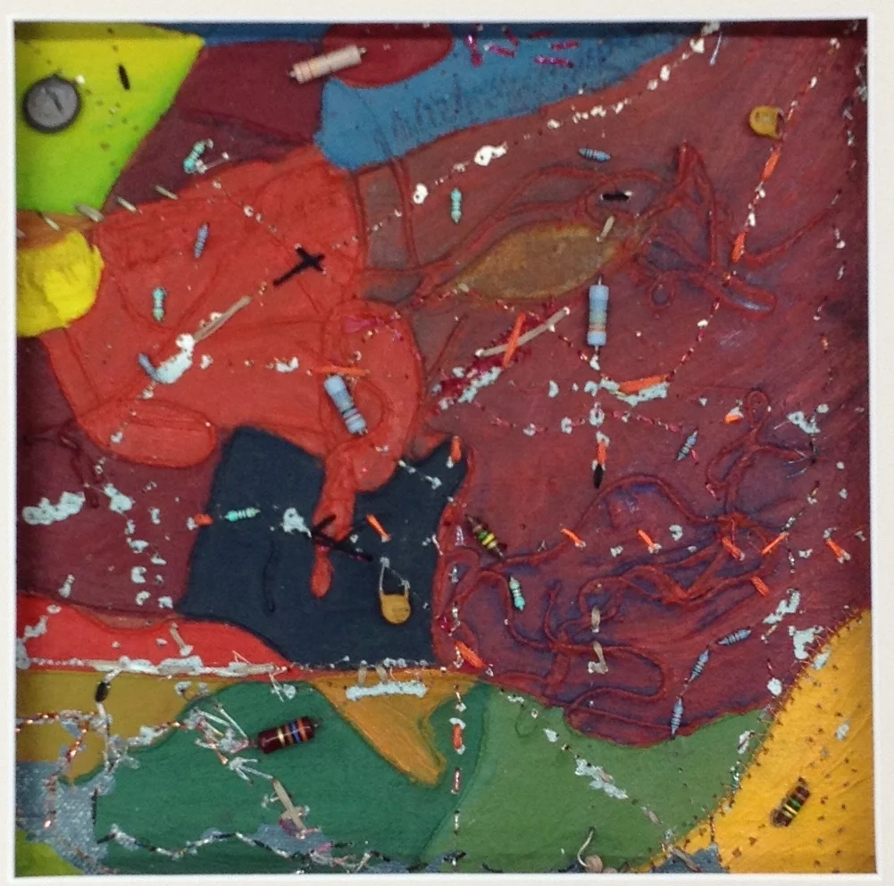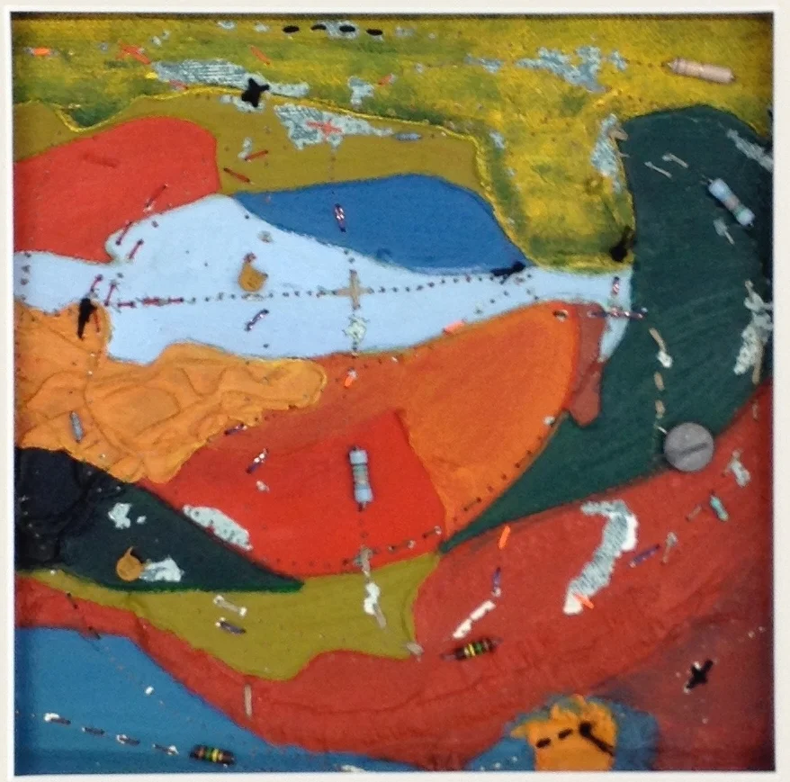 These four matted artworks are pieces of a string landscape artwork in oil that I did some years ago.... I let them sit a while, then I decided that they were not finished, so I began stitching on the pieces. Some of the oil cracked off for a really nice affect. I used different coloured string as well as ceramic transistors on wire here and there to give two points of view to the landscape....it almost feels like a folk art painting in some sense.... but you the viewer can see what you want. I would like to sell them as a set in the order you see here.